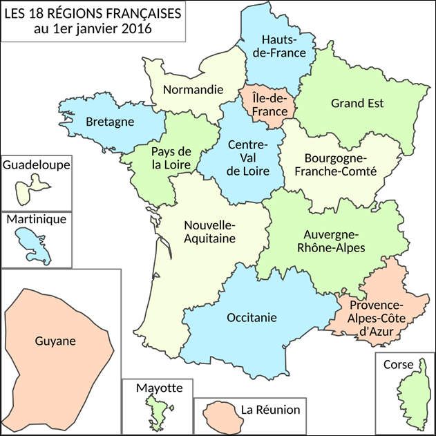 U administrativnom pogledu Francuska je podeljena na 18 regiona, od kojih je jedan Korzika, a pet su prekomorski. Nova Kaledonija je poseban kolektivitet. Regioni su podeljeni na departmane, kojih u Metropolitanskoj Francuskoj ima 94. Pet regiona nema izlaz na more, a od regiona koji imaju izlaz na more jedino Hauts-de-France (čita se O de Frans) nema nijedno ostrvo.